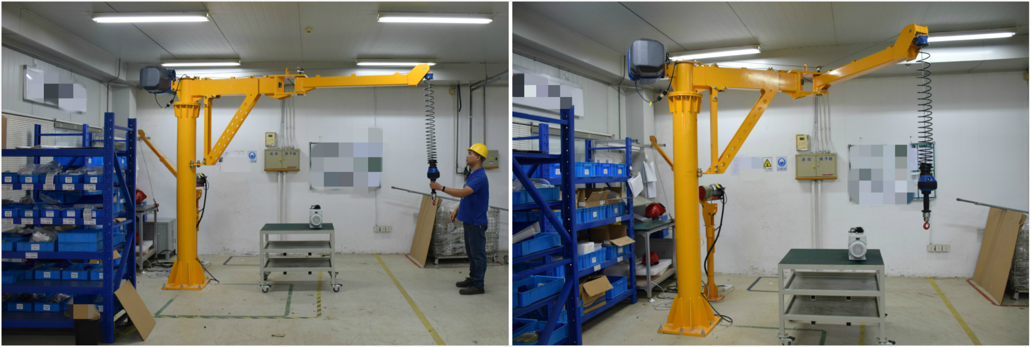 ● 克鲁克折臂吊解决了客户空间狭窄安装设备困难的问题——立柱被安装在室内合适的角落中,不会占用有限的工位空间,但3m的折臂长,主臂回转360°,副臂回转300°,可有效覆盖整个工位。使用配置的同轴压力感应手柄,工人可采用悬浮模式轻松实现精确装配,上下减速点和上下限位帮助工人更舒适地操作设备;