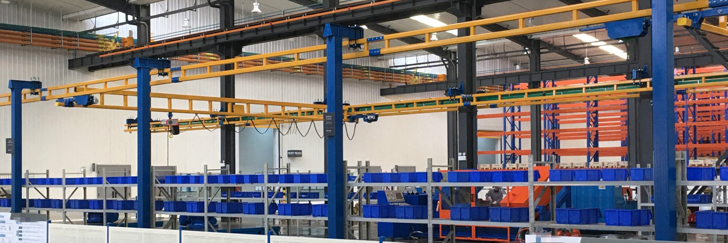 ● 客户厂房设计时屋顶和立柱都没有考虑额外的承重,工位多,起吊频繁,且行车速度较慢,效率较低,浪费能源,售后维护比较麻烦,故传统行车远远不能满足其要求。而克鲁克轨道式自立起重机自带支撑结构,对厂房屋顶无压力;在水平方向采用无动力运转,推拉轻便,提高了生产效率;