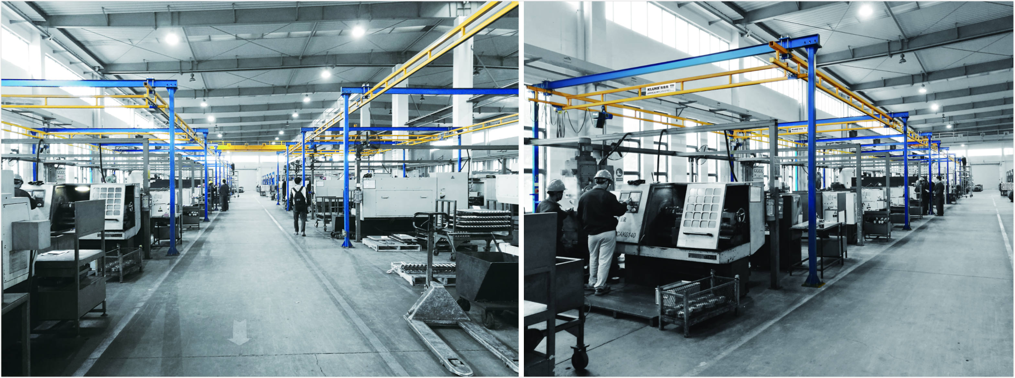 KLUKE解决方案:克鲁克组合式自立起重机,额定载荷250kg,配套250kg环链电动葫芦,布局合理高效,不影响行车正常使用。