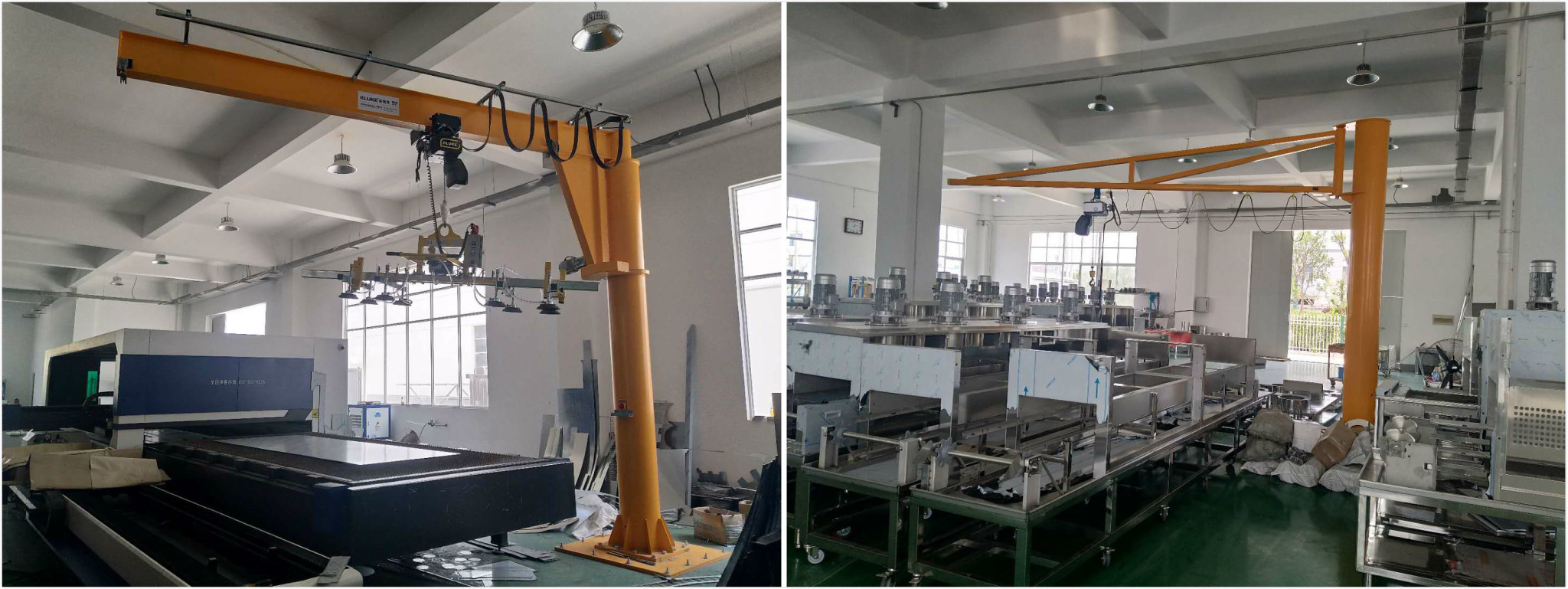 KLUKE解决方案:克鲁克轨道式旋臂起重机(自立),工字钢旋臂起重机(自立)各一台,分别配环链电动葫芦+定制吸盘——