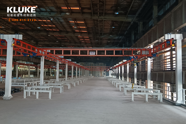 KLUKE解决方案:KLUKE为客户推荐了共用支撑立柱及无横梁的非标设计方案,10组组合式自立起重机,起重量2t,主梁长度可达12m,跨度达11.4米。
