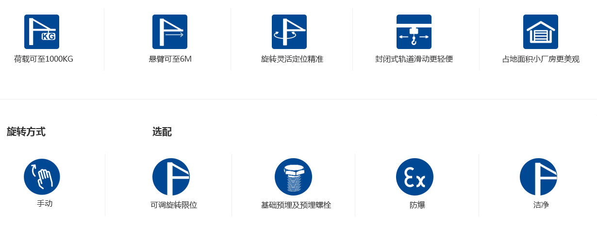 备注1、石墨铜套回转结构设计,自润滑使摩擦阻力小,操作轻便,免维护。2、标配进口化学螺栓,充分确保您的使用安全。3、旋转限位在安装时根据现场需求进行固定。4、回转驱动经独特调质热处理,强度高的同时,经久耐用。5、定制工装固定生产,确保水平与平行角度控。6、各部件标配二次保护装置,给您的使用提供双重安全保障。7、根据工艺需要,独立安装于车间地面,地基要求仅为混凝土C30,厚度≥200mm。8、粉末静电喷涂工艺,干膜厚度不低于120μ,表面处理美观,光泽、平整、附着力强、经久耐用。